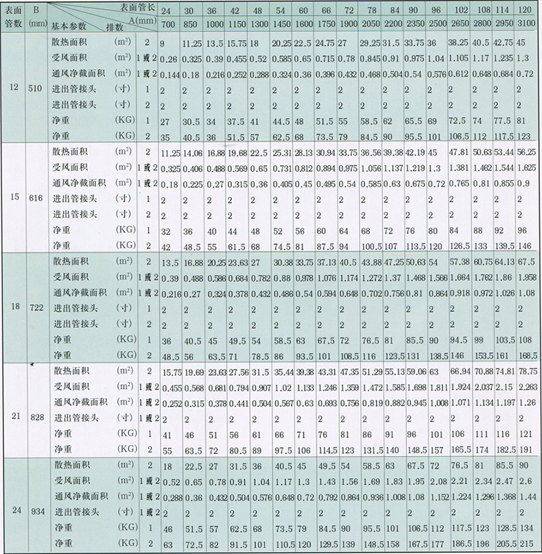 UⅡ型散熱排管有各種不同表面管長、管數、排數及翅片片距的多種配合,計有大小規格七百六十五種。